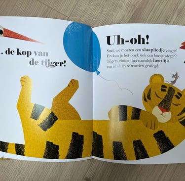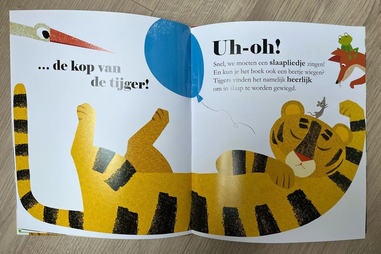 Nou ik kan je vertellen dat ik ook geboeid tot het eind was, ik wist niet wat er ging gebeuren met de tijger, of het een goede tijger was of een slechte tijger. In het begin van het boek staan alle dieren aan de linkerkant van de slapende tijger, maar ze moeten over de tijger heen om naar de goede kant te komen. We weten niet waarom, maar dat maakt het ook wel spannend. Ze hebben een aantal gekleurde ballonnen mee die ze helpen om over de tijger heen te komen. Het zijn spannende momenten waarbij de tijger bijna wakker wordt en wij de lezers bijvoorbeeld moeten zingen of het boek moeten wiegen zodat de tijger blijft slapen.